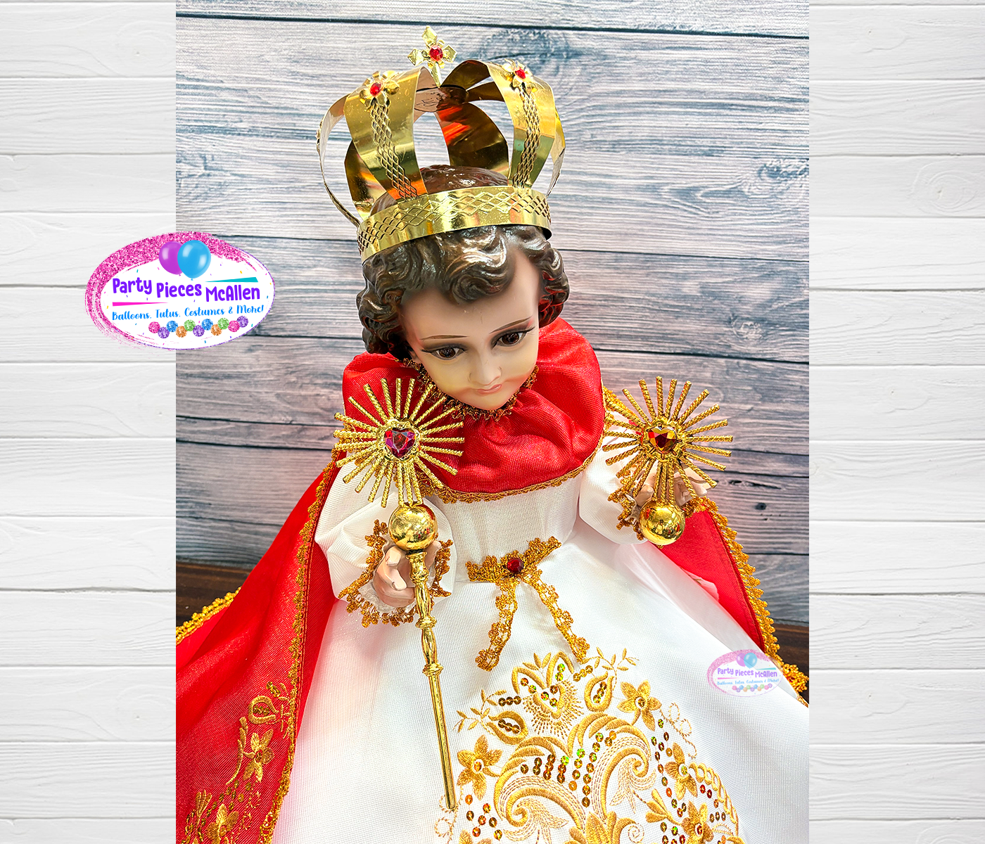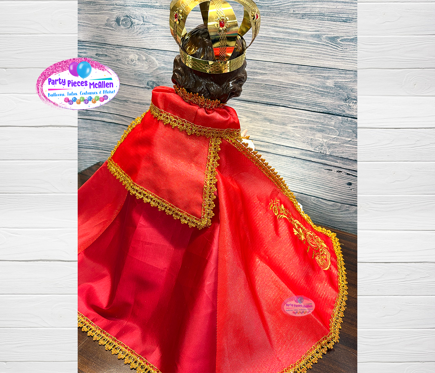 Features a red cape with beautiful gold embroidery, gathered sleeves, beautiful gold crown and cute accessories your Niño Dios will look divine in this ensemble! 💫
