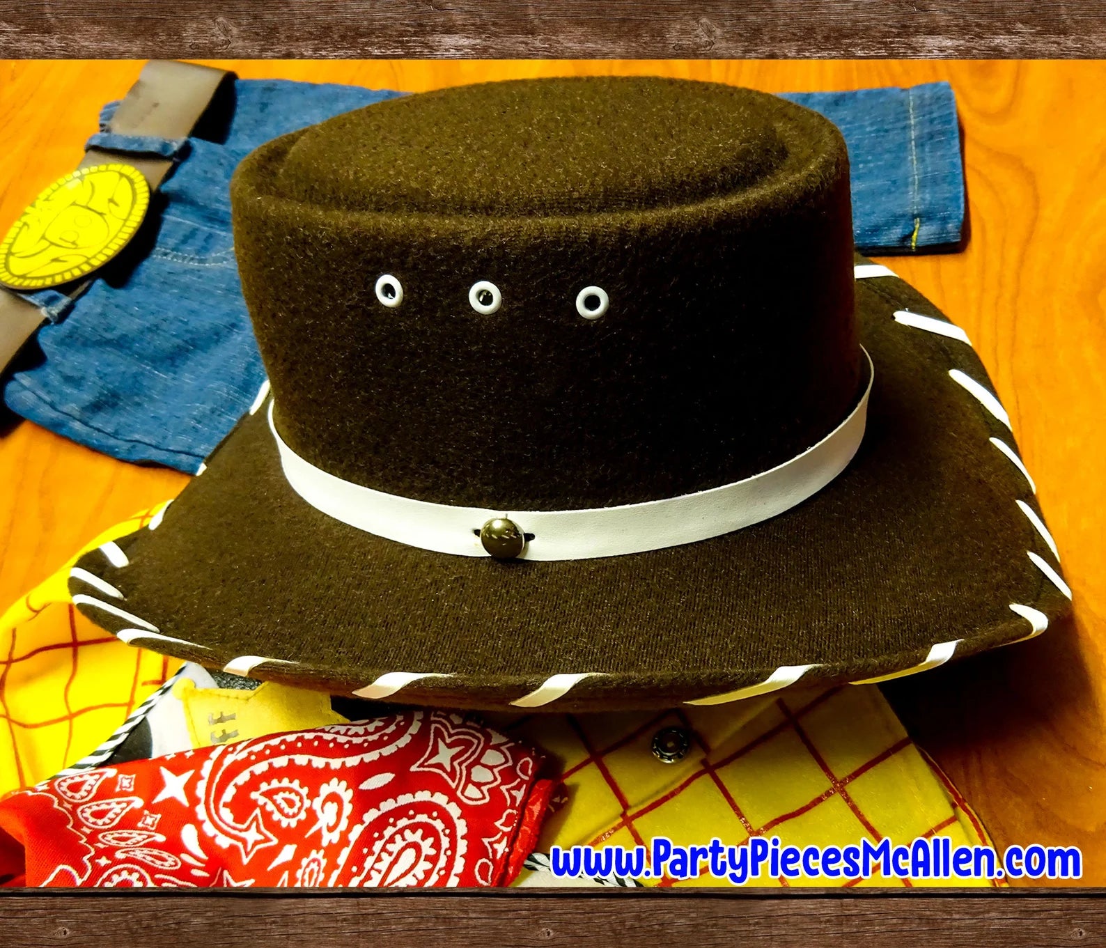 Yee-haw! This is the perfect costume that will make your little one feel like his favorite toy came to life and will be ready for any adventure! This 6 pc Costume Includes:- Button up shirt- Pattered Vest with Sheriff detail- Red Bandana- Holster Belt- Jeans - Real Cowboy Hat! (not felt or foam- 2 sizes for hat- will go according to size, if unsure, send me your little boys head circumference for best fit.)The shirt is a button down with red striped details and real buttons! The vest has cow print fabric that is decorated around the edge and has a Sheriff patch. The bandana has western style white swirl details. The denim jeans have an elastic around the back and the holster belt has a velcro closure. A real cowboy hat (not soft foam like others) is the final touch for the costume- it has white details on the edge just like the real thing.